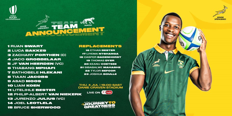 Nhleko explained the variations to the match 23: “Whilst we wanted to keep the spine of the team intact, we must manage the load of the players sensibly because this is a demanding tournament due to the short turnaround time between matches and being adaptable in different circumstances.
