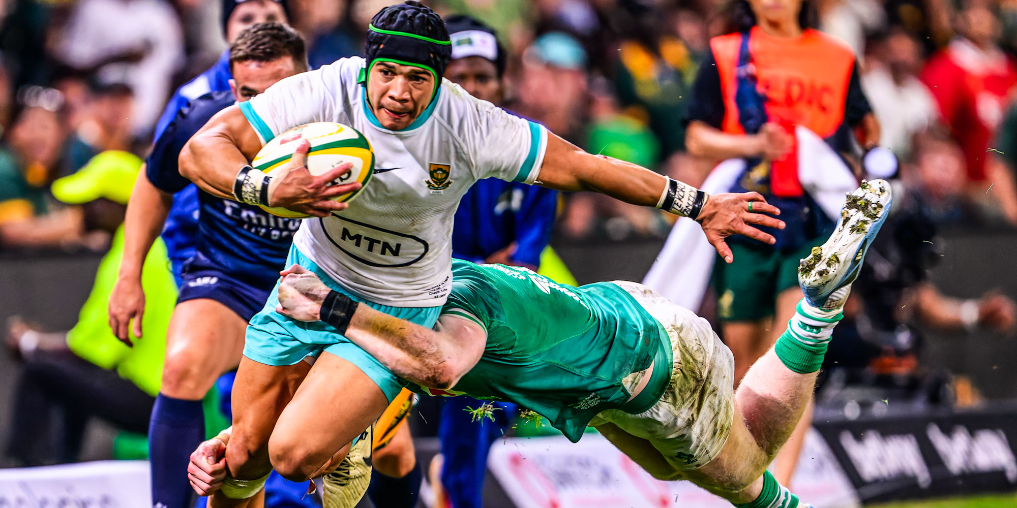 Du Toit cut back on the angle on Feinberg-Mngomezulu’s well weighted pass after eight phases to plunge over from less than ten metres for the second and Arendse turned loose ball at the back of a halted maul into a barely credible try behind the posts as he danced past statuesque Wallaby forwards, finding a way to the line through the heavy traffic.