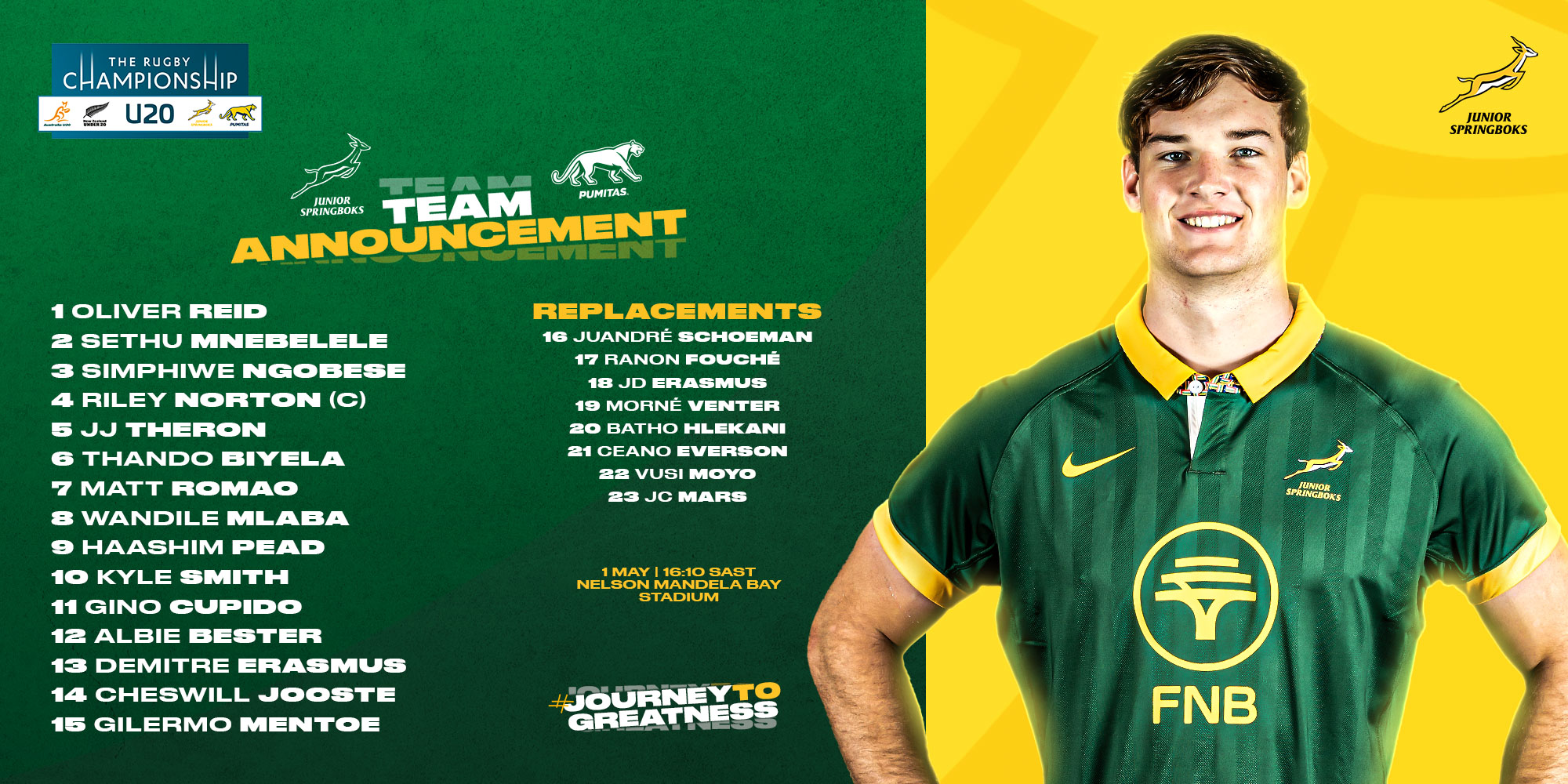 Assistant Referees: Christopher Allison (SARU), Sean Muller
