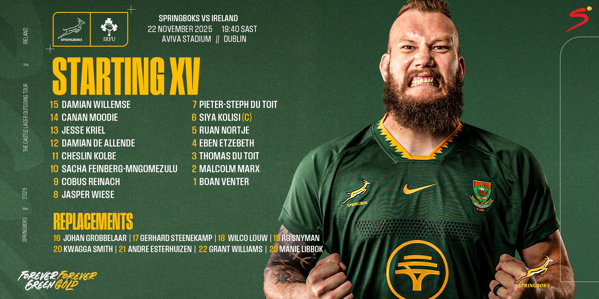 The Springboks maintained their winning streak on the 2025 Castle Lager Outgoing Tour when they outplayed Ireland by 24-13 (halftime 19-7) at the Aviva Stadium in Dublin on Saturday, in a performance that confirmed their number one ranking in the rugby world.