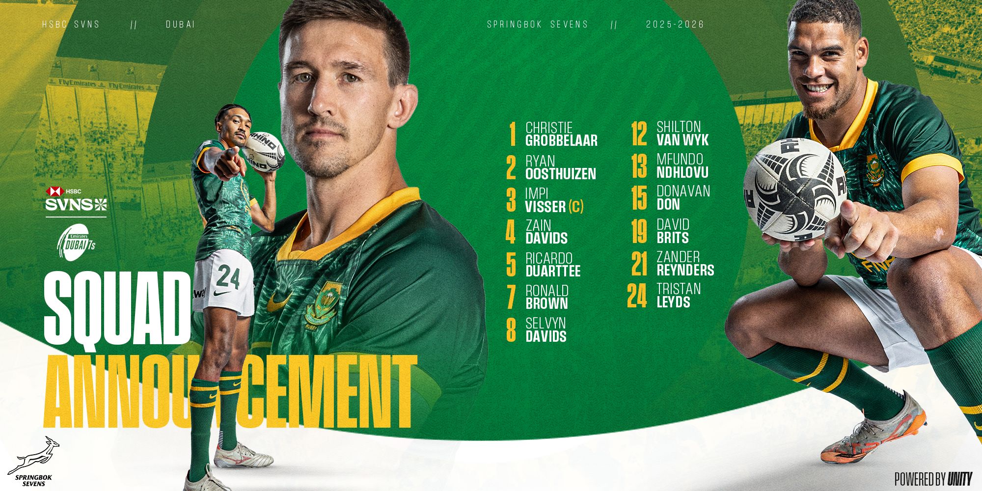 Eleven players involved in their season-ending HSBC SVNS World Championship victory in Los Angeles in May will be part of the Springbok Sevens squad for the 2026 HSBC SVNS opener in Dubai next weekend, while Blitzbok head coach Philip Snyman added experienced stalwarts Christie Grobbelaar and Donavan Don to his team.
